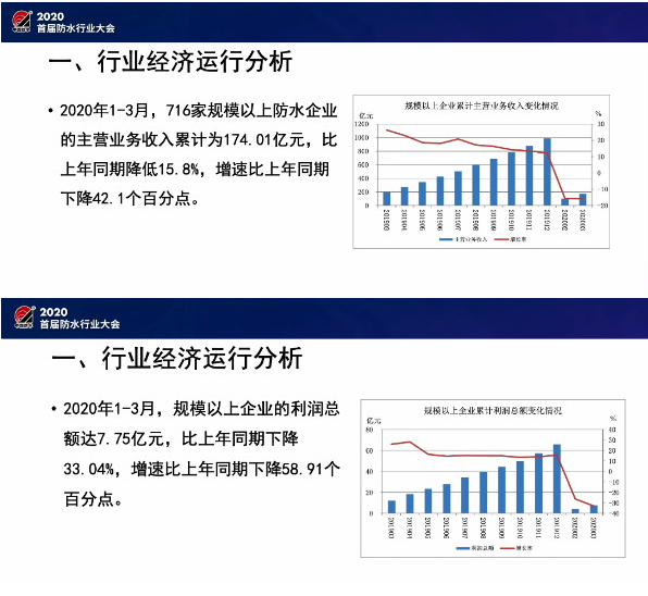 在會議現(xiàn)場,中國建筑防水協(xié)會秘書長朱冬青作出了關(guān)于《后疫情時期防水行業(yè)的挑戰(zhàn)和機遇》的主題演講,他從防水行業(yè)經(jīng)濟形勢分析、疫情對行業(yè)的影響分析和行業(yè)發(fā)展的挑戰(zhàn)與機遇等方面對主題演講進行了專業(yè)解讀。朱冬青秘書長在演講中表示,今年一季度,受疫情影響,防水行業(yè)迎來了前所未有的收入及利潤雙下降,對行業(yè)發(fā)展帶來了不小的沖擊。
